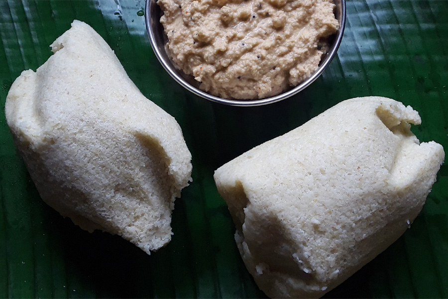 25. Serve idli hot or warm with coconut chutney or huli (samber / lentil-vegetable stew).