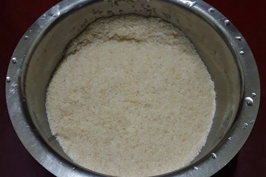 7. Now take the roasted kesar rava in a large bowl and rinse it a couple of times or until it is clean.