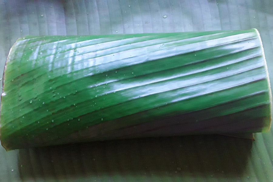 12. Then, take one banana leaf sheet and roll it to form a hollow cylinder.