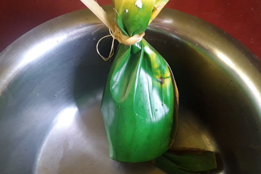 13. Tie at one end with banana leaf fiber thread. This way, make kotte or cups with all 3 medium or 5 small sheets of banana leaf.