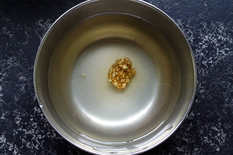 4. Rinse the sesame seeds once or twice and drain the water completely. Keep it covered aside.