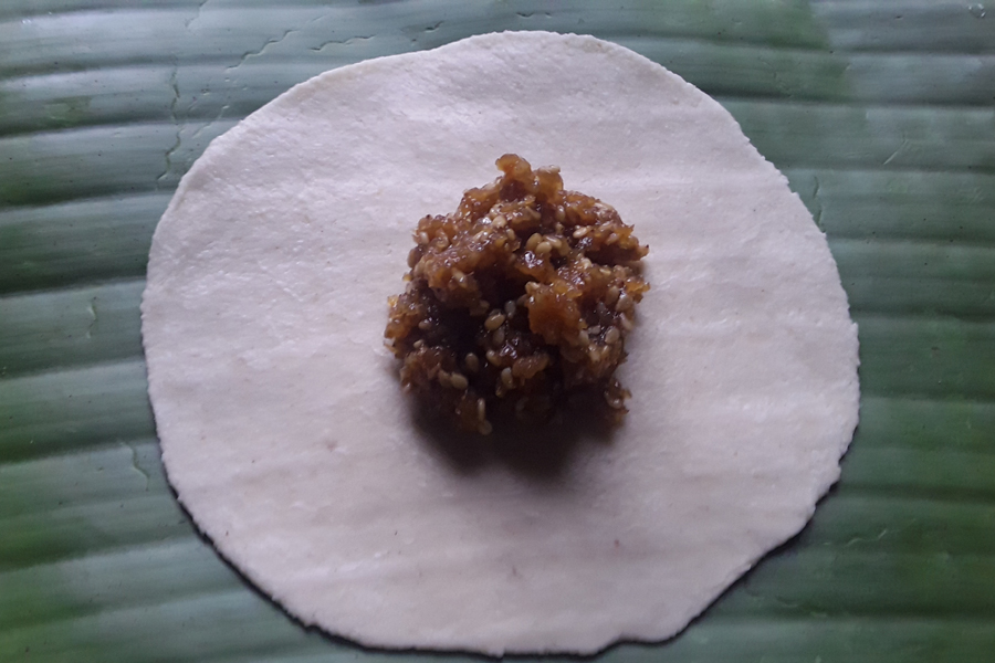 Over time, while making the modaka, if the dough becomes dry, sprinkle some hot water and mix.
