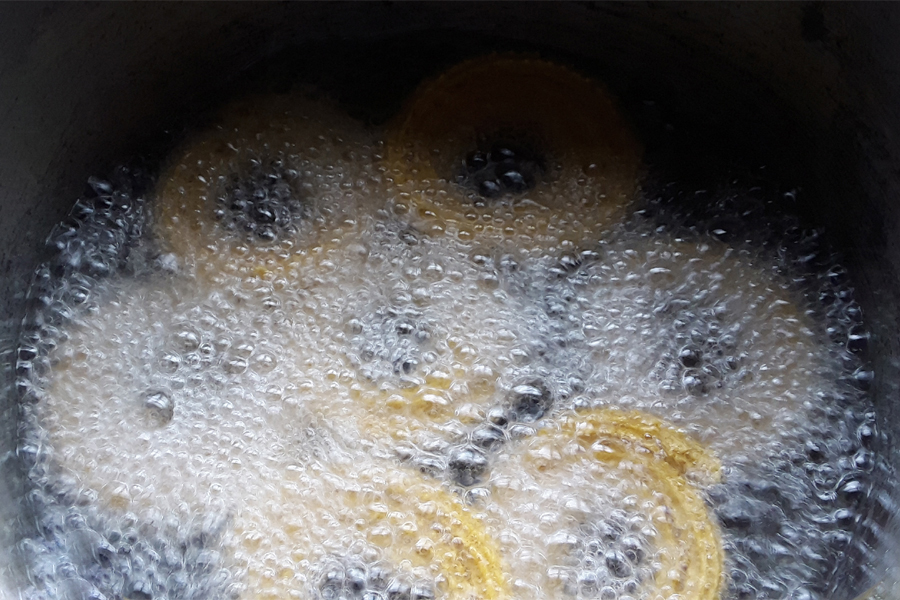 12. Heat enough oil for deep frying in a pan. Lift the dough spirals carefully and slid into the hot oil.