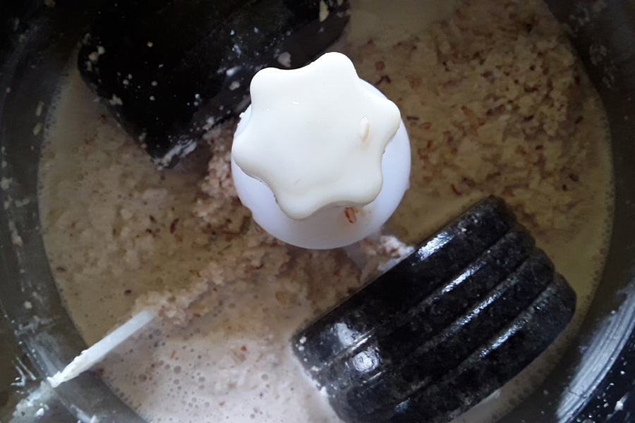 3. Add soaked rice, 1 tablespoon sesame seeds, ½ tablespoon carom seeds, 1 teaspoon cumin seeds, ¼ teaspoon asafoetida, 5 dry red chillies or as required, and salt as required to a grinder or mixer jar. Add water as needed and grind to a smooth batter.