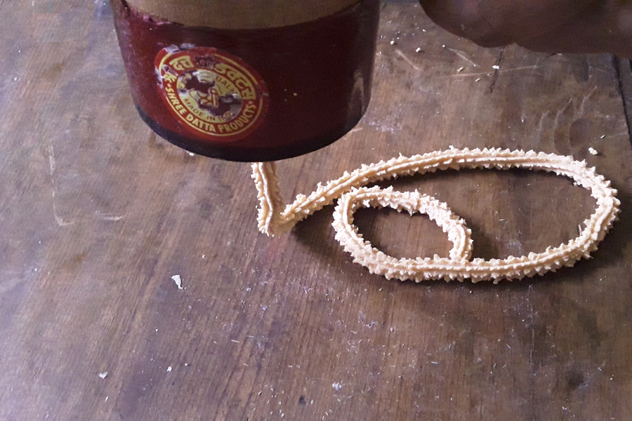 10. Press the chakli maker to release strands on a wooden platform, banana leaf, plate, or butter paper. You can move the chakli maker in rounds to get a spiral shape or just the strands of dough that you can shape into spirals. Decide on your chakli size and break the strand and lightly press it to the last circle of the spiral.