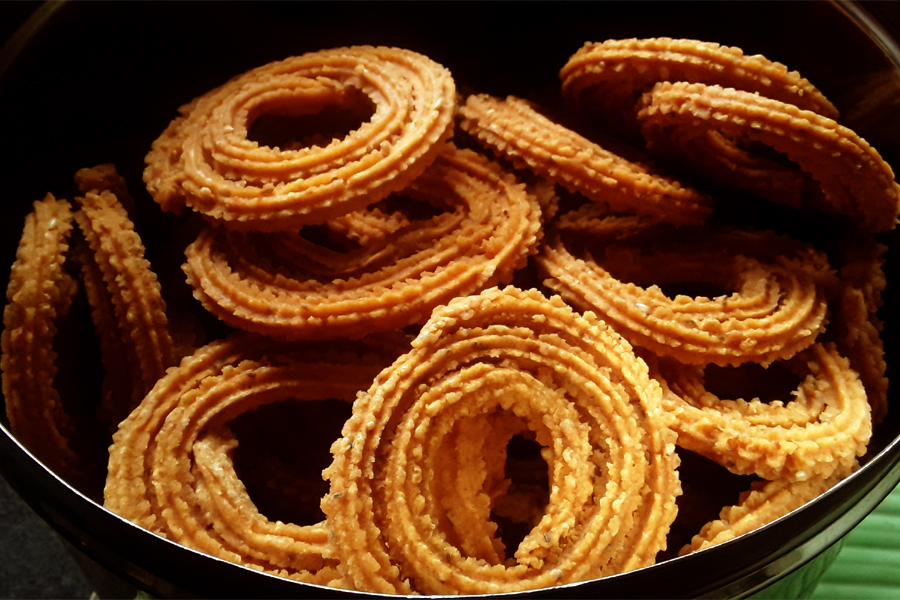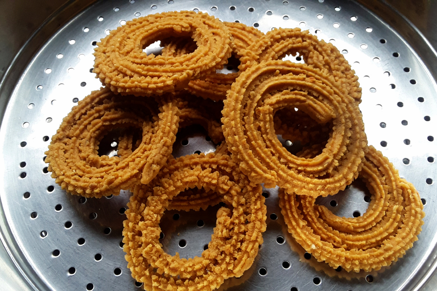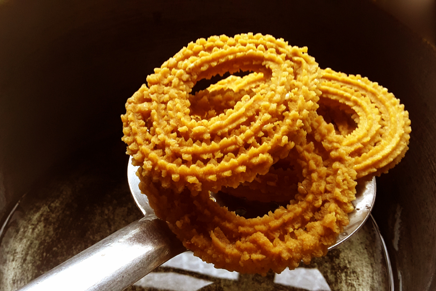 15. Make and fry chakli with the remaining dough. Offer the dish to Ganesha. Serve and eat on Ganesha Chaturthi festival. Store the rest in a clean and dry container with a tight lid.