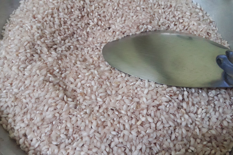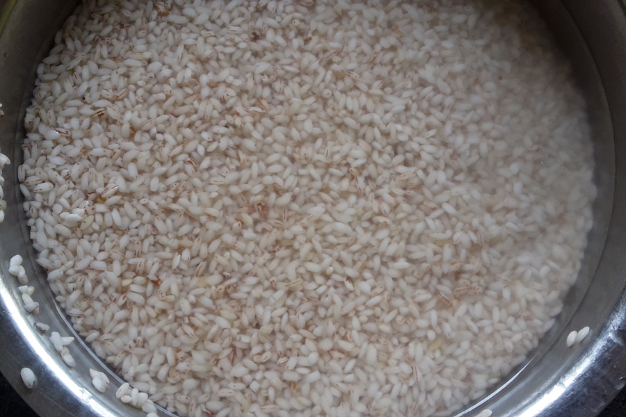 1. Take 250 g chakli rice in a thick pan and dry fry / roast on medium heat. No need to brown it. Keep stirring and switch off once it turns hot and aromatic. Let it cool.