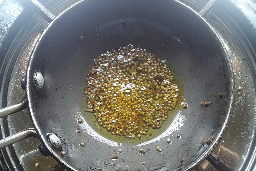 7. Heat 1 teaspoon oil in a tempering pan. Add ½ teaspoon mustard seeds, 1 pinch asafoetida. Let the mustard seeds splutter.