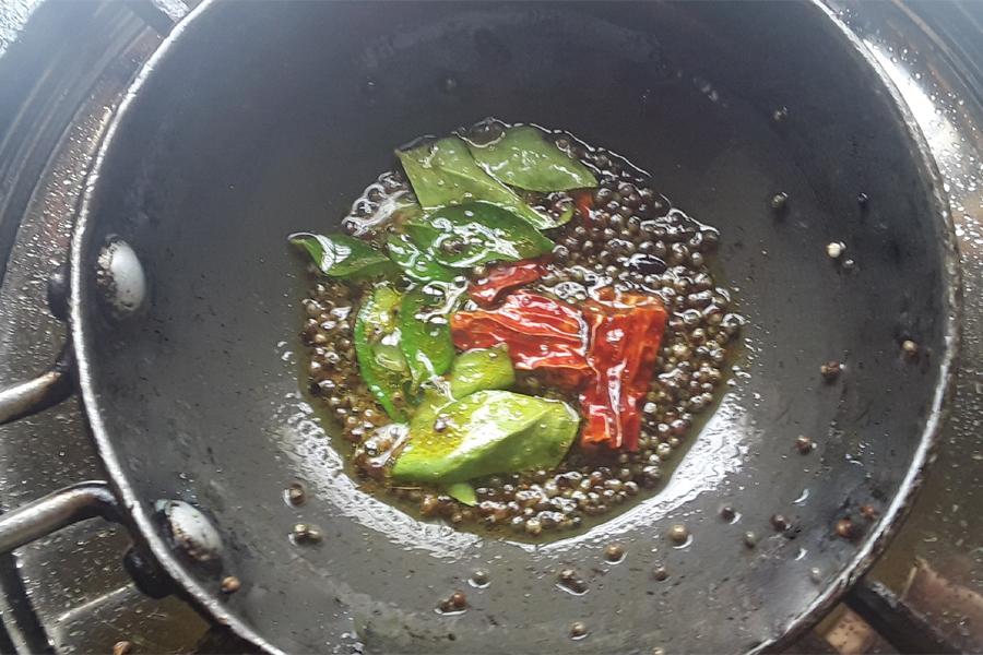 9. Switch off and pour the tempering over the tambli. Mix well and serve with hot rice.