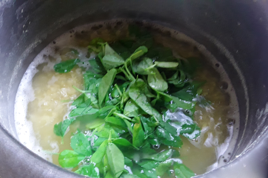 4. Once the lentils are almost cooked, add fenugreek leaves. Cook them to a soft texture.