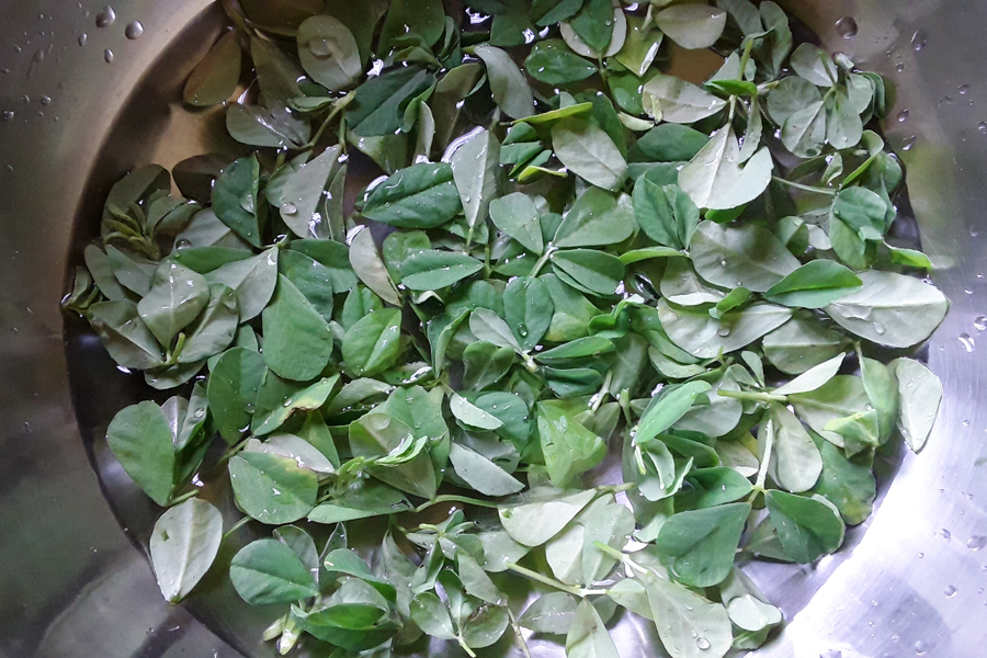1. Soak fenugreek leaves in salt water for about 20-30 minutes. Then rinse them and keep aside.