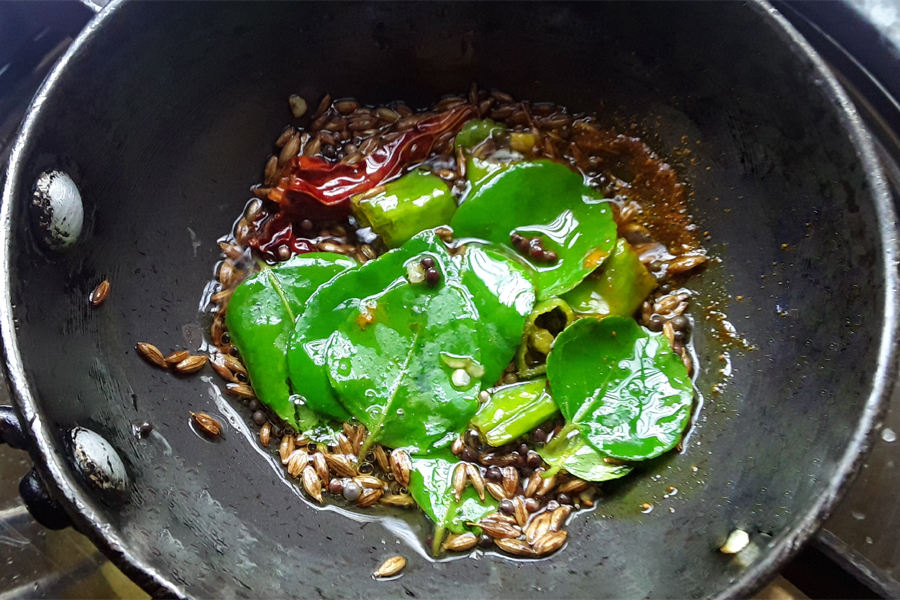 7. Then add chopped green chilli, dry red chilli pieces, turmeric powder, and curry leaves. Mix them with oil properly.