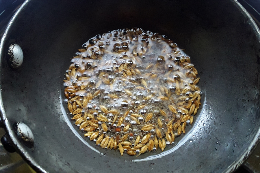 6. Take 1 teaspoon oil in a pan and heat the oil. Add cumin seeds, mustard seeds, and a pinch of asafoetida. Let the cumin and mustard seeds crackle.