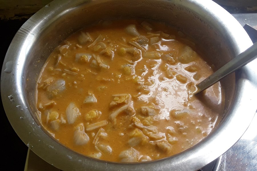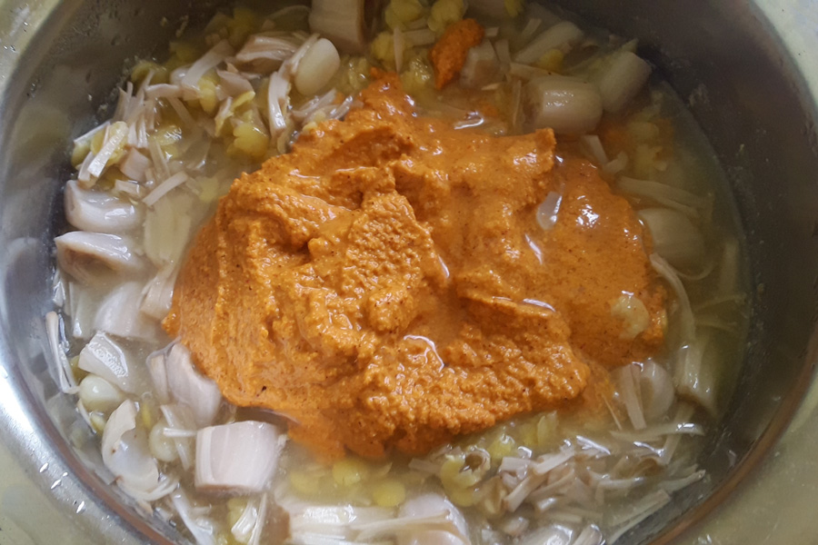 18. Once the lentils are cooked to a soft texture, add cooked jackfruit and mix well.