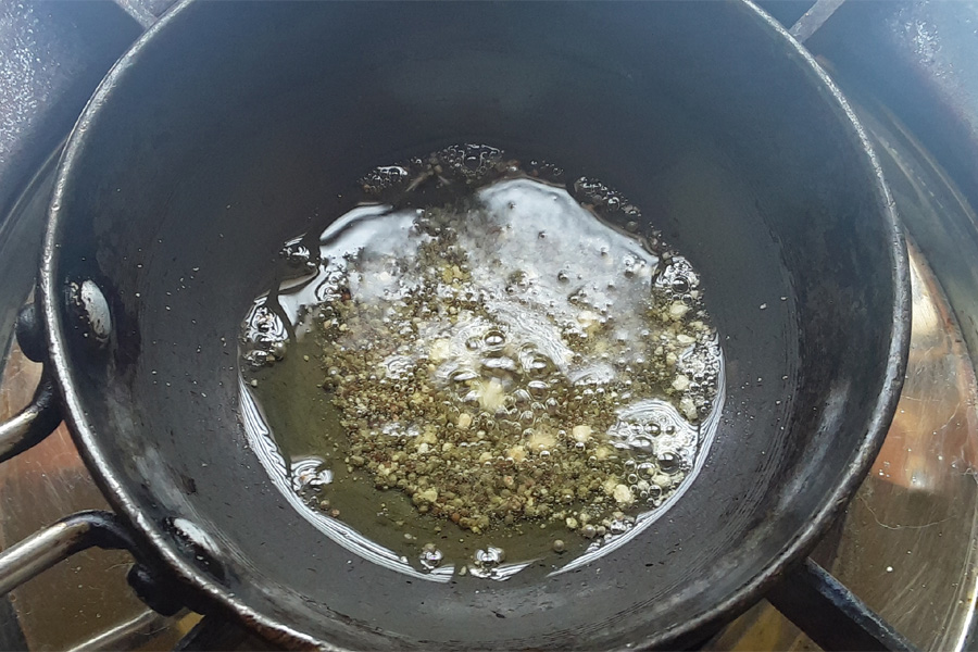 9. While the lentils and jackfruit are cooking, heat 1 teaspoon of oil in a thick pan on a low heat.