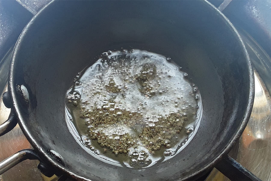 27. In a small pan, heat 2 teaspoons oil. Add 1/2 teaspoon mustard seeds. Let them crackle.