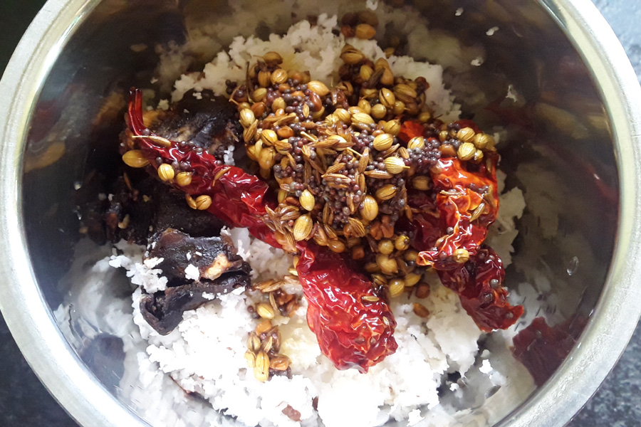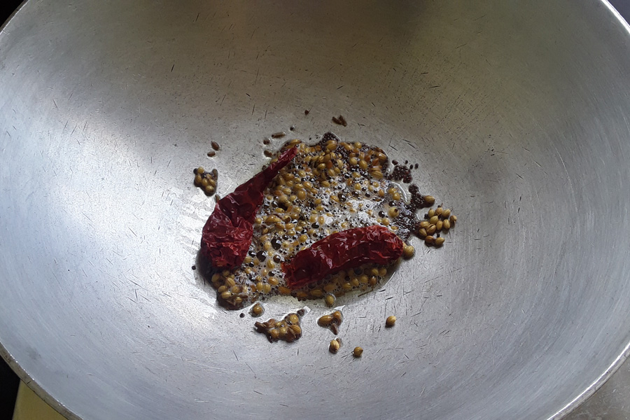 12. Add 2 long dry red chillies or as required. Give a stir, and switch off the heat. Let the spices cool down.