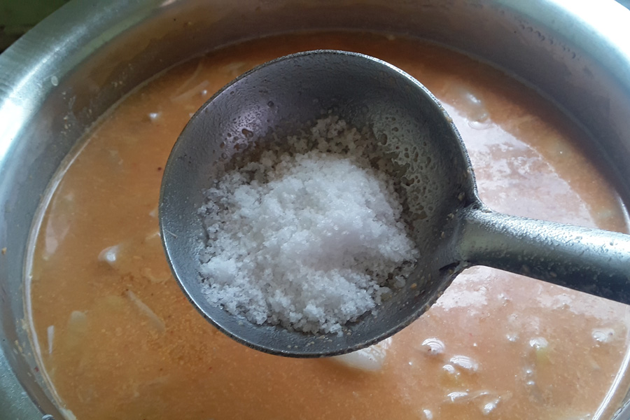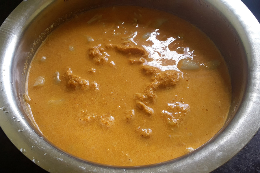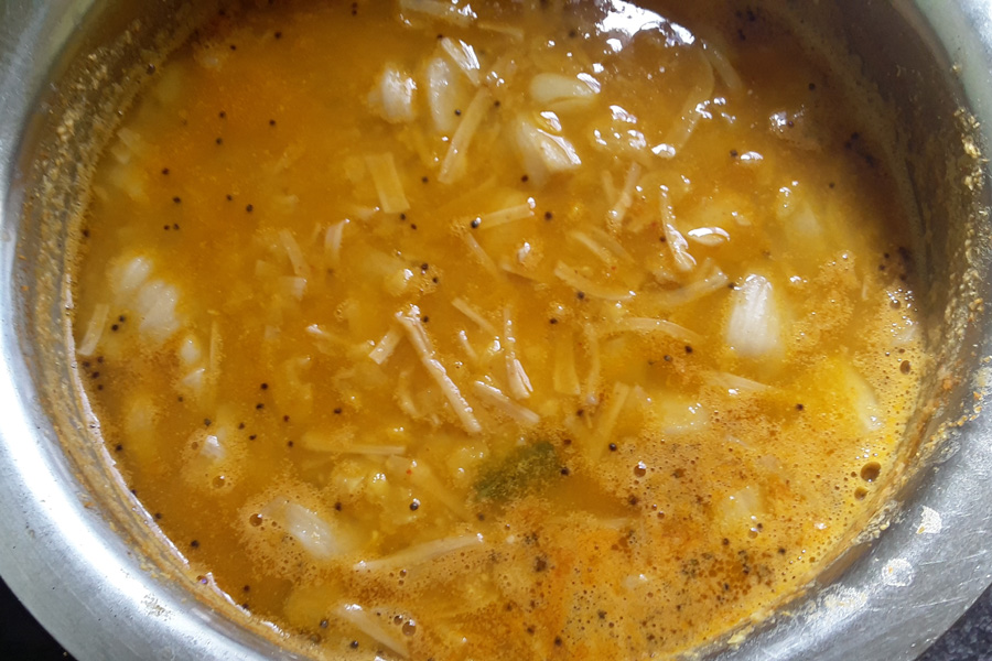 Cover the pan or vessel with a lid for 5 minutes, so that the aroma and flavors from the tempering mixture gets infused with the Huli.