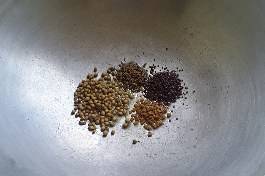 10. Add 1.5 teaspoon coriander seeds, 1/2 teaspoon cumin seeds, 1/4 teaspoon fenugreek seeds, 1/4 teaspoon mustard seeds.