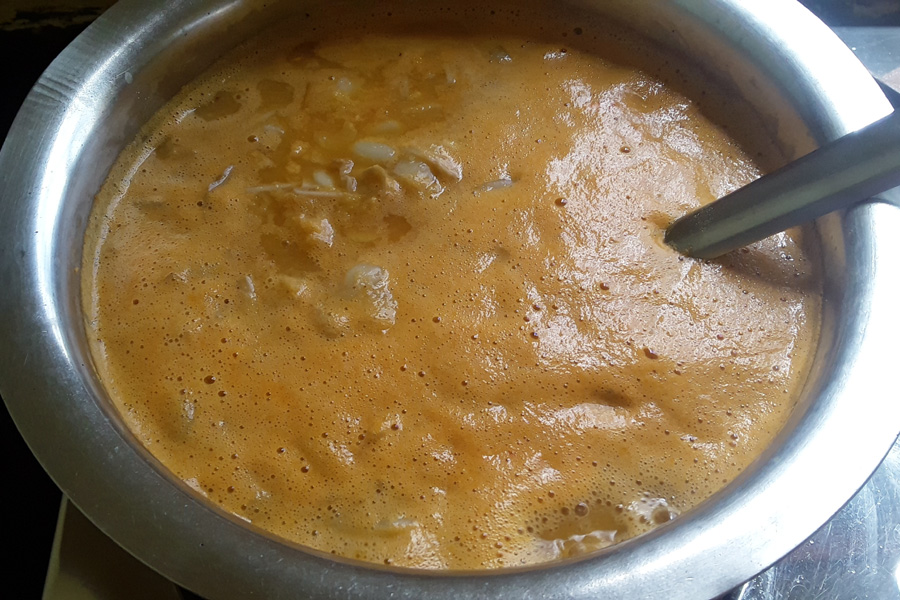 This amazingly tasty jackfruit Huli or stew is made by slow cooking the tender jackfruit and pigeon pea lentils to a soft texture, and then mixed with ground spices. This is similar to any regular huli, but fewer spices are used to keep the jackfruit flavor enhanced. Jackfruit should be tender that you should be able to cut through the seeds easily to make this Huli. Tough, brittle, or ripe jackfruit cannot be used to make Huli.