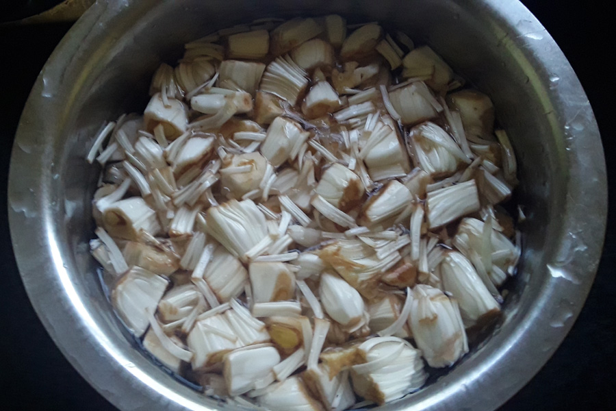 3. Soak the chopped jackfruit in water for about 5 to 10 mins to remove the gum, if any.