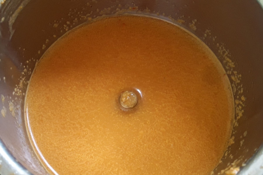 20. Add 1/2 cup water in a mixer or grinder jar. Swirl and shake the jar so that the spice paste at the bottom and sides of the jar gets mixed with the water.