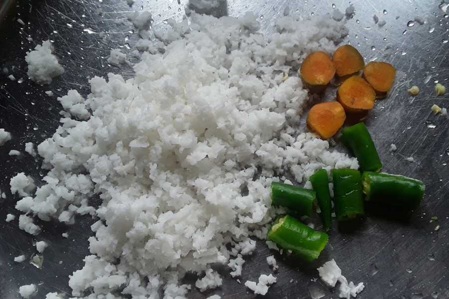 1. Grate ¼ cup fresh coconut. Roughly chop 1 green chilli, and turmeric root.