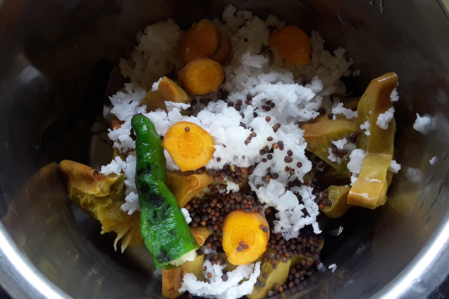 3. Take chopped star fruit, chilli, turmeric, grated coconut, and ½ teaspoon mustard seeds in a mixer jar.