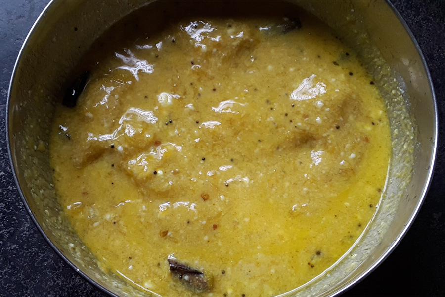 Sasime is a flavoursome dish with mixed taste and is served with plain rice. Sasime is made with specific mangoes called sasime hannu, and gets its mixed taste with the ingredients jaggery, curd, chillies, and of course mangoes itself. Ground coconut is also added to sasime to enhance its texture and the taste, but this is optional.