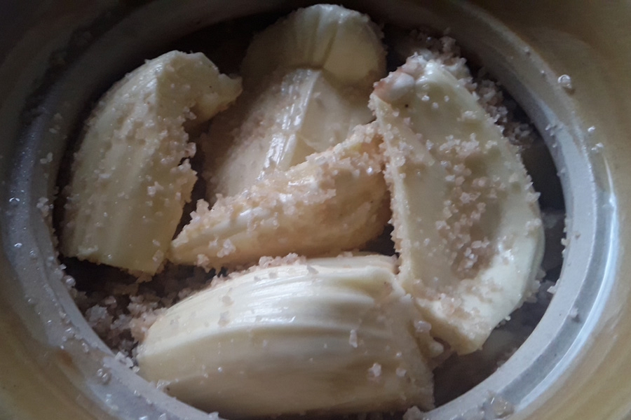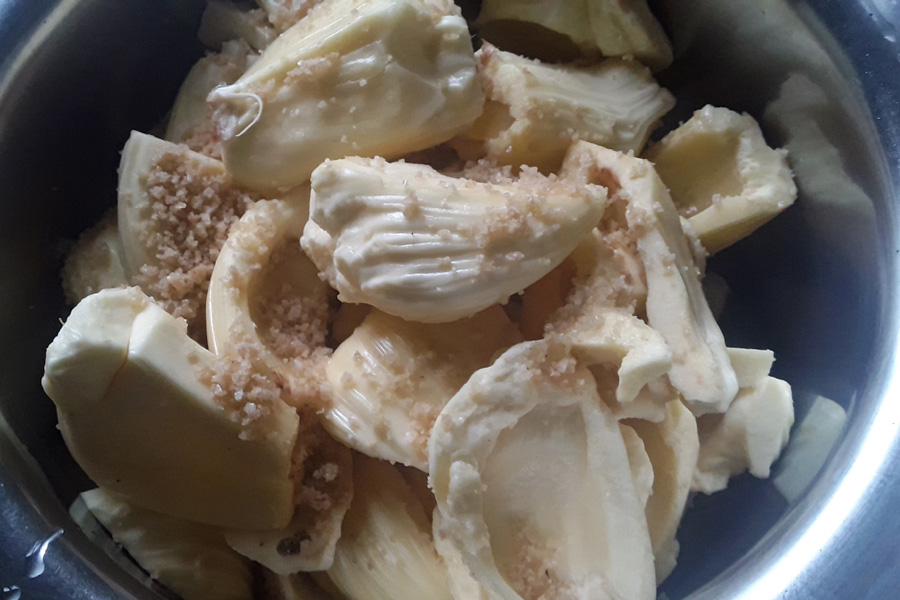 6. Transform the salt mixed jackfruit pulp to a jar.