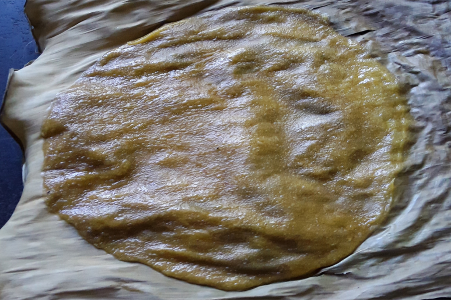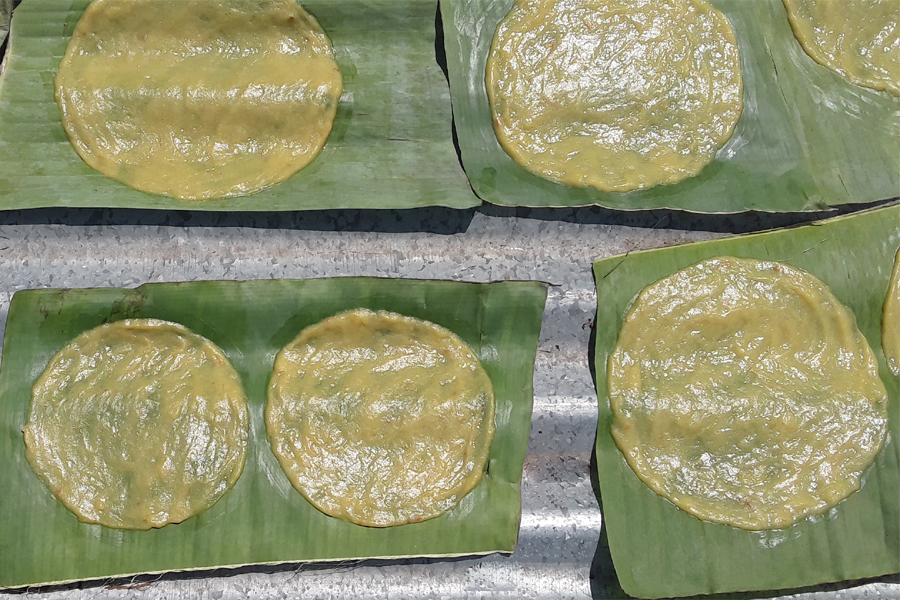 6. Take a banana leaf. Take a small portion of the jackfruit puree and put it on the backside of the leaf. With your fingers spread the puree to medium thick round shape.