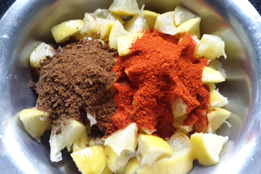4. Take the chopped lemons in a clean and dry mud/ clay / glass / stainless steel bowl. Add roasted and cooled salt. Mix well.