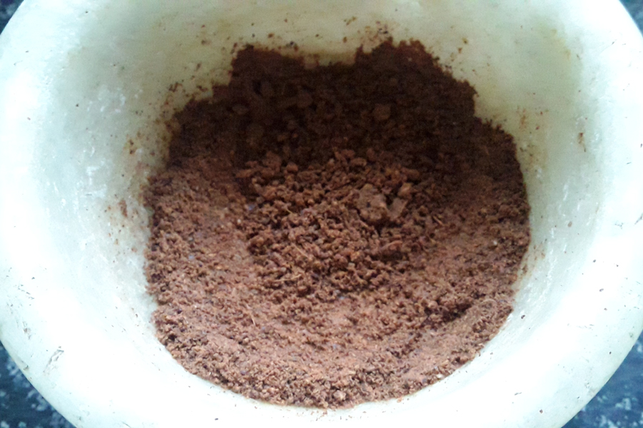 7. Now take all the roasted spices in a mortar. Powder them using pestle.