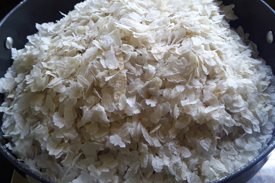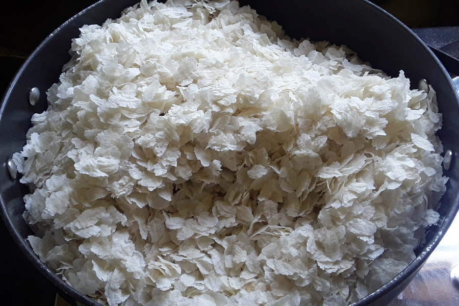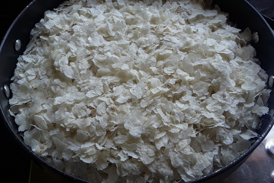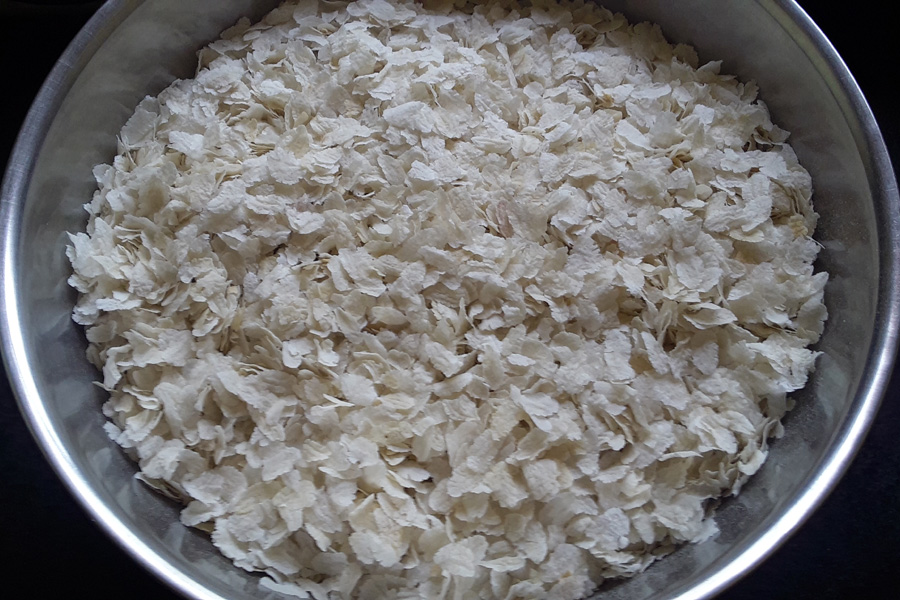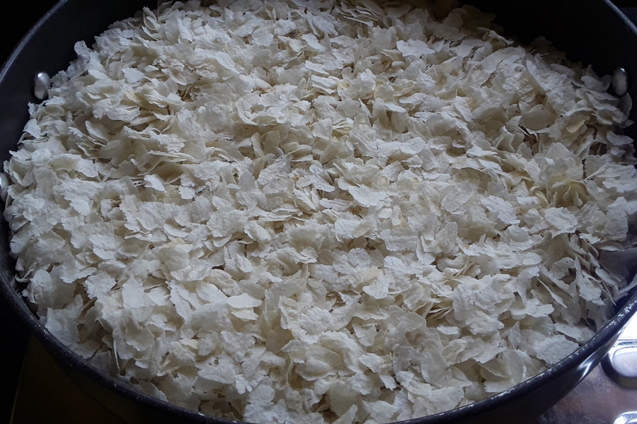 5. Heat a thick, wide pan on a low flame. Add thin flattened rice flakes to the hot pan.