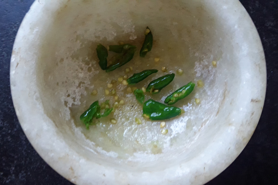 3. I have used tiny green chillies, and I have crushed them. These green chillies are called Sanna Menasu.