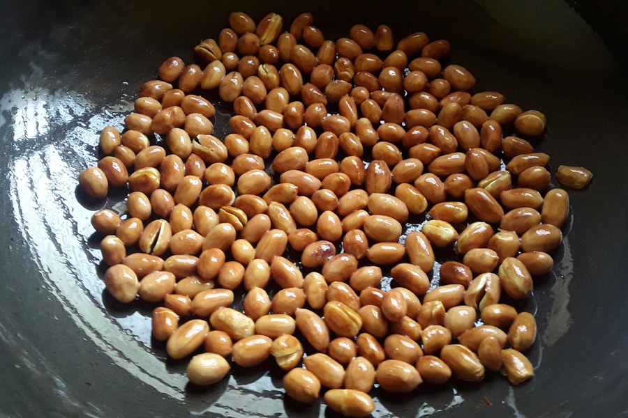 13. Then add 100 g groundnuts or peanuts and fry them till they become crisp. Stir often while frying.