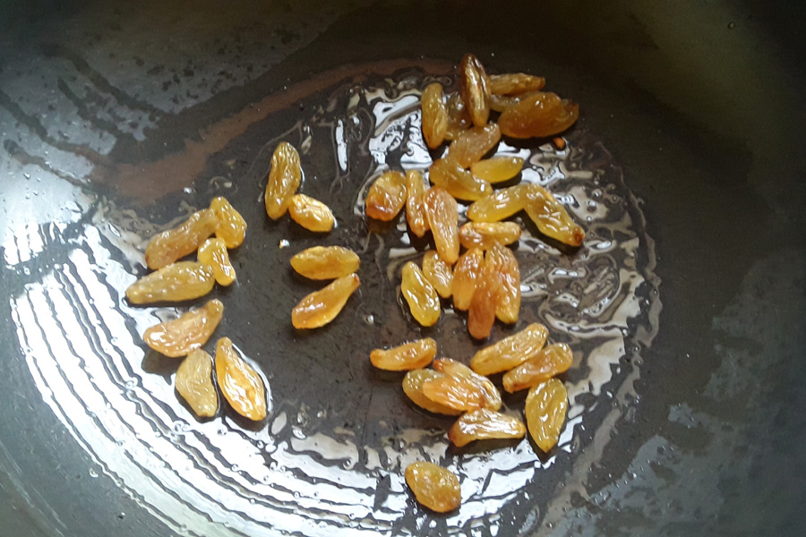 11. Now add 25 g raisins and fry them for a few seconds while stirring often. If you prefer, you can fry until they swell and become plump.