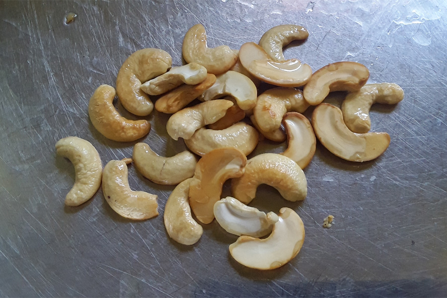 9. Heat 1 to 2 teaspoon of oil in a pan. Add 25g cashews and fry them till they become crisp. Stir continuously while frying.
