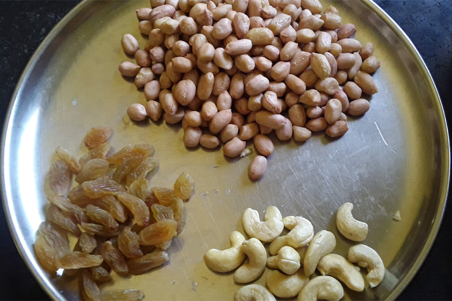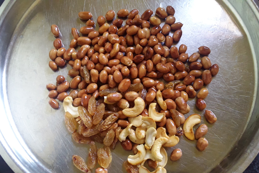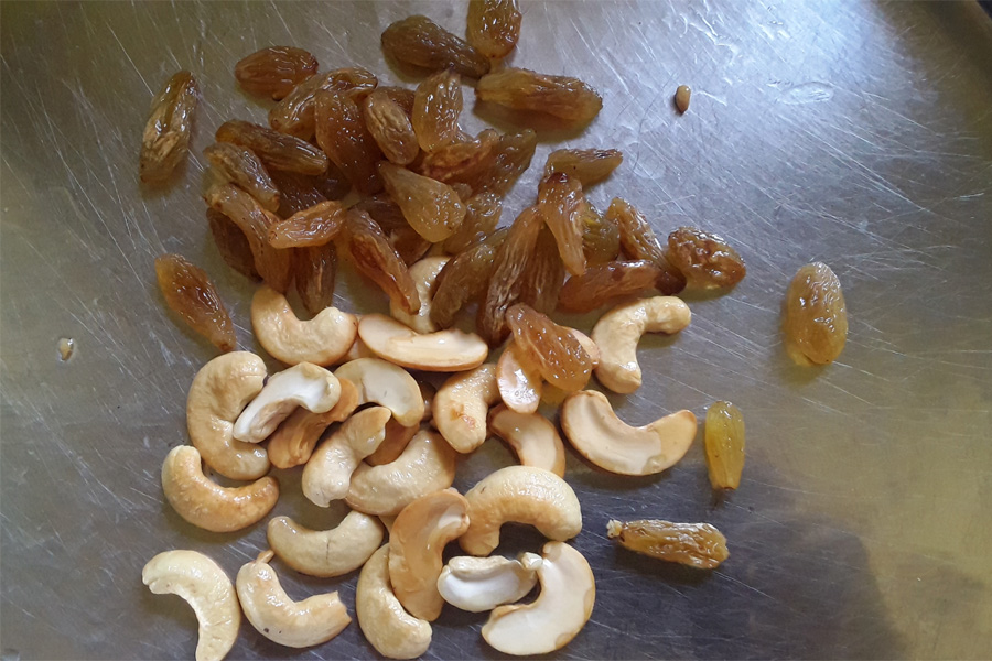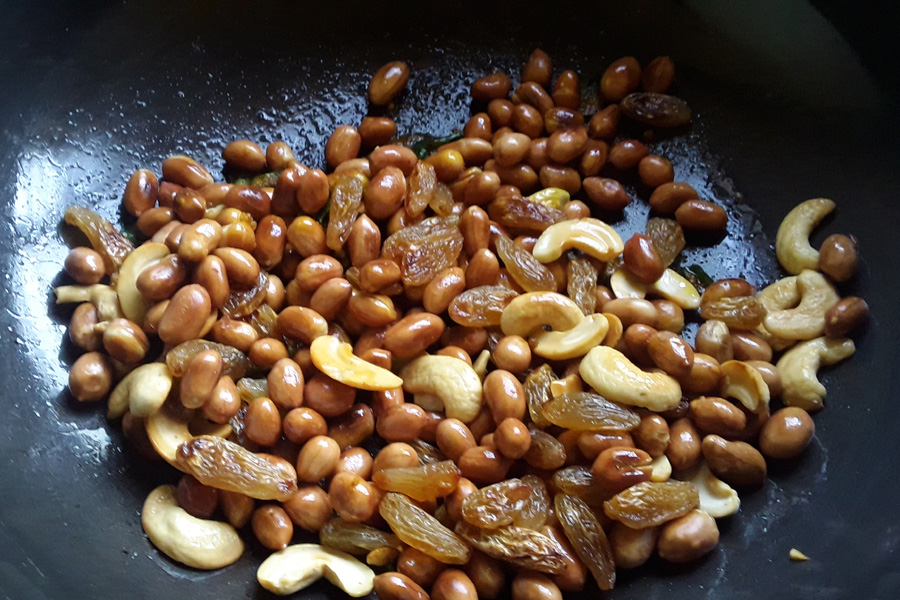 14. Remove and place the groundnuts with cashews and raisins.