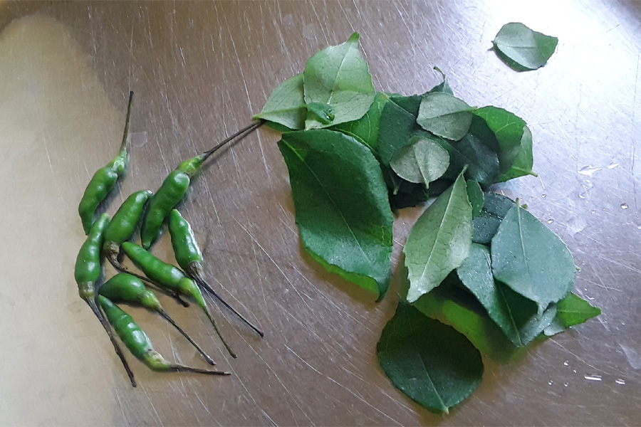 2. Rinse green chillies, curry leaves and chop them.