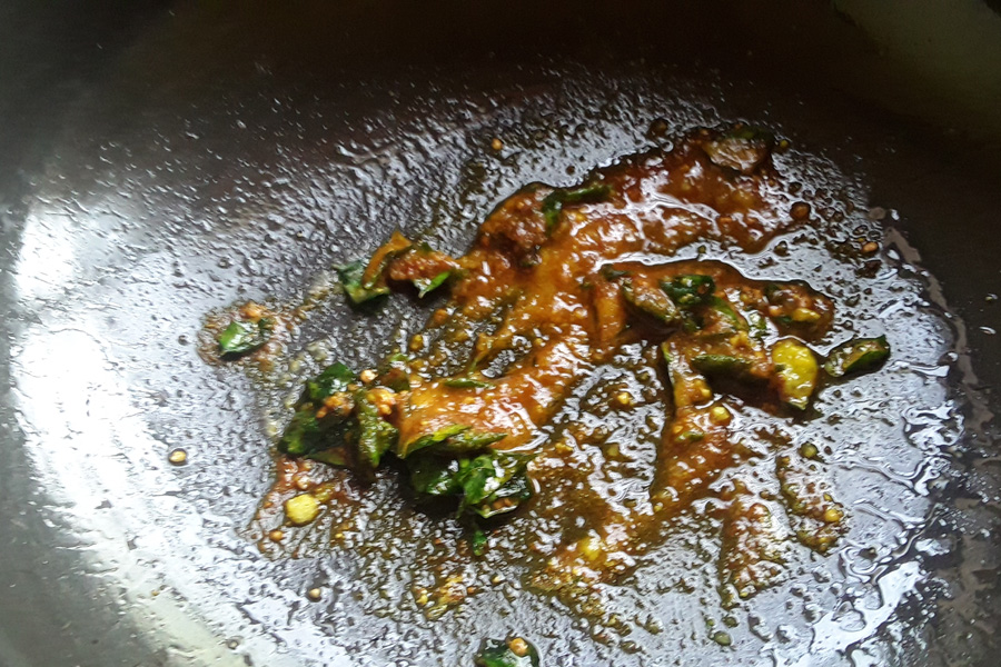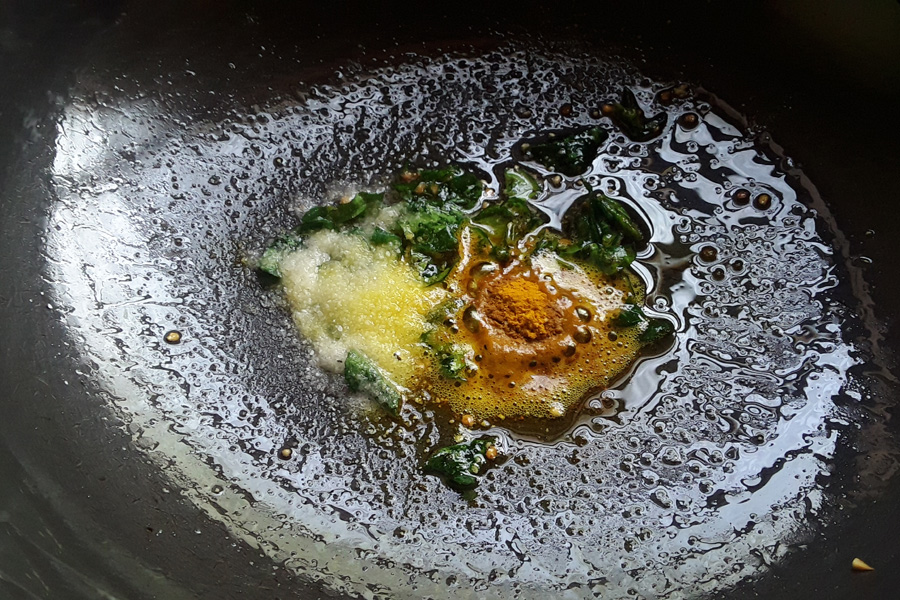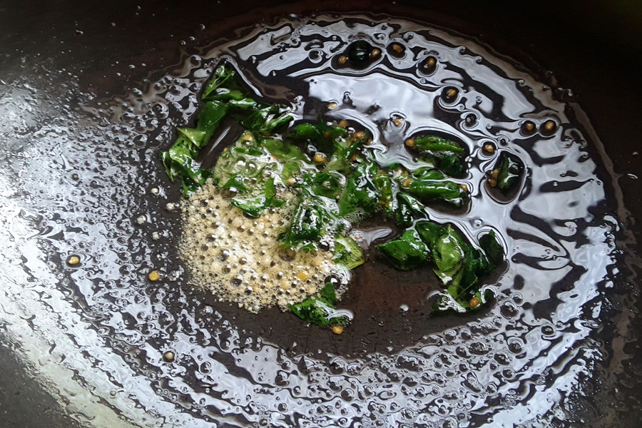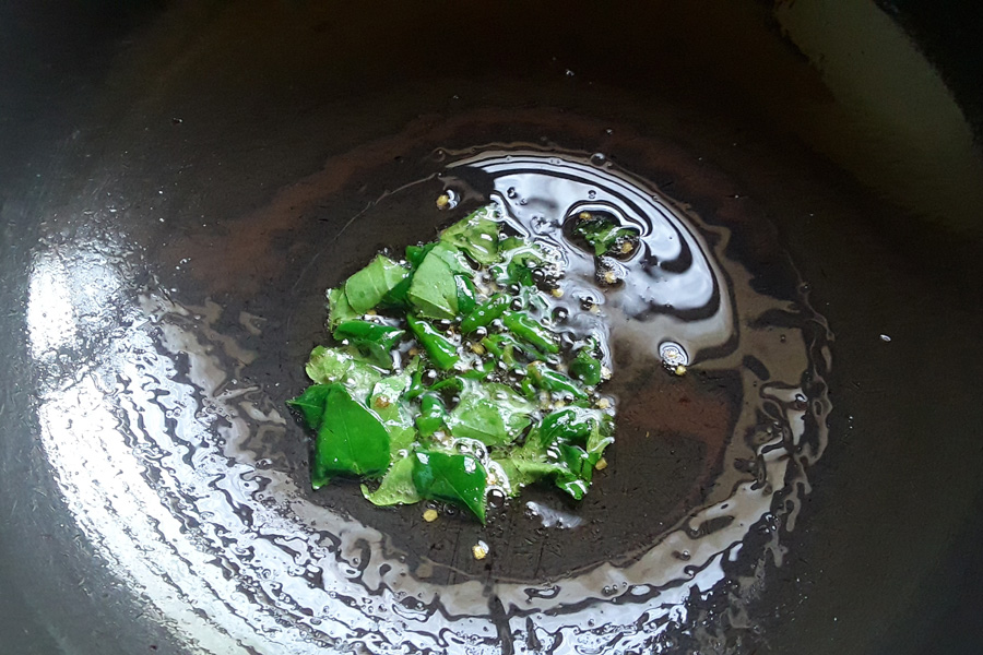 15. Heat 1 tablespoon of oil in a pan on low flame. Add chopped green chillies and curry leaves. Stir and sauté till they become crisp.