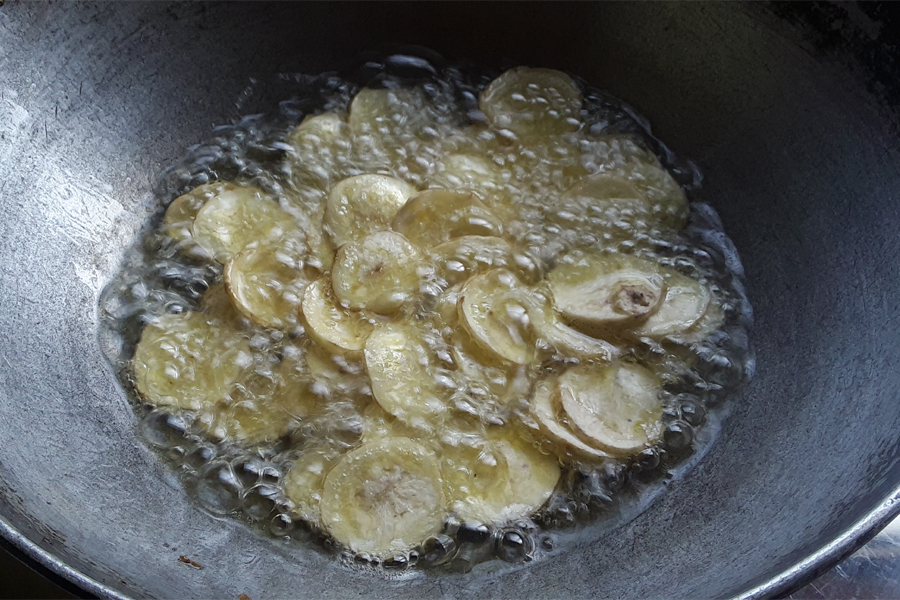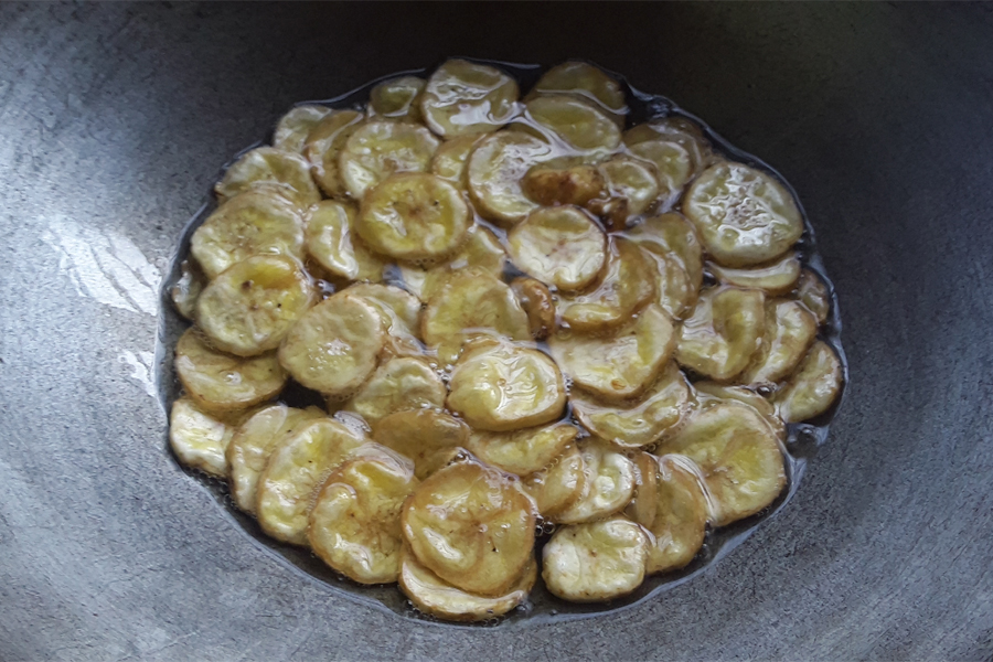 11. Keep turning and frying them until they become crisp. Note that bubbles and sound subsides when the banana slices turn crisp and cooked well.