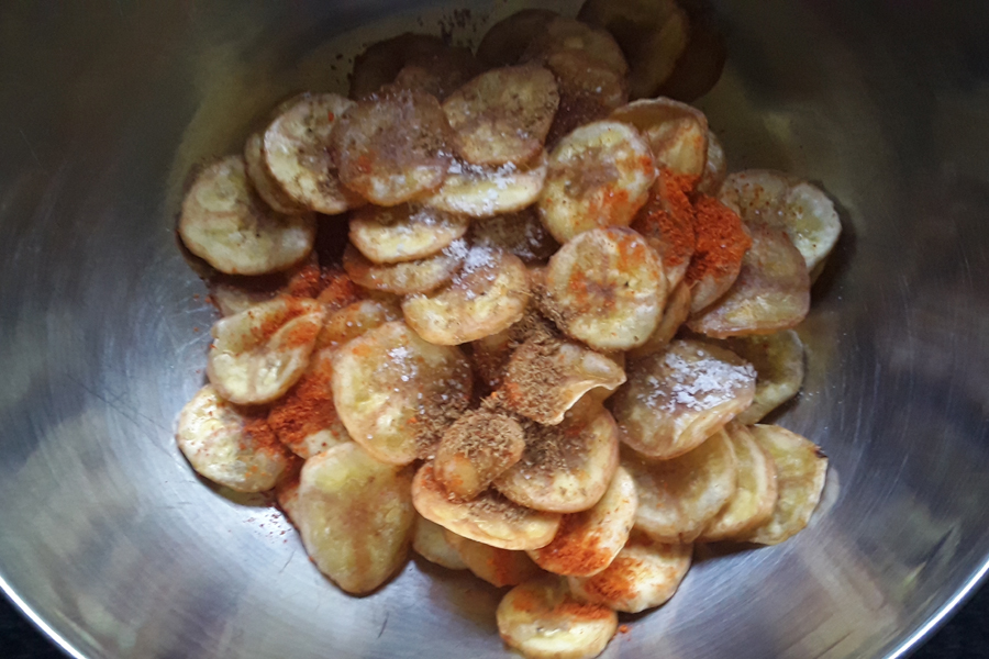 14. After 2 minutes transfer banana chips to a mixing bowl.