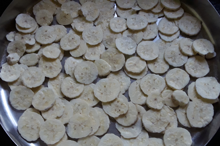 Slice the banana medium thick as shown in the picture in step 3. Slice should not be either too thin or too thick. Banana chips taste great when sliced into medium thickness.