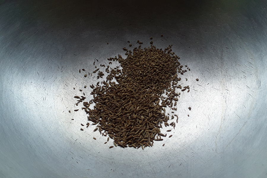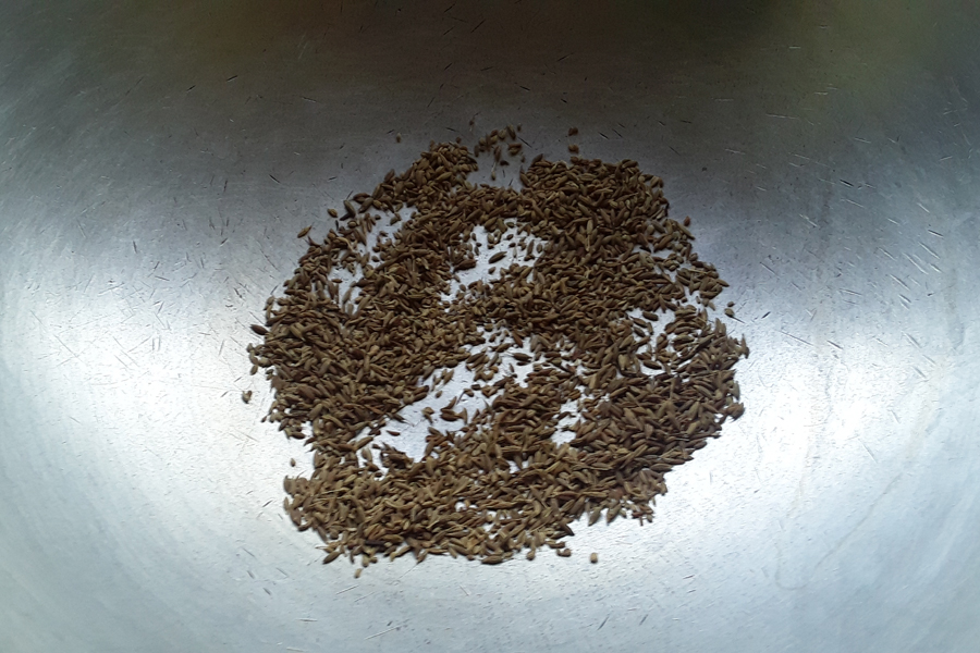 4. Heat a pan. Add ½ tablespoon cumin seeds and ½ tablespoon carom seeds.