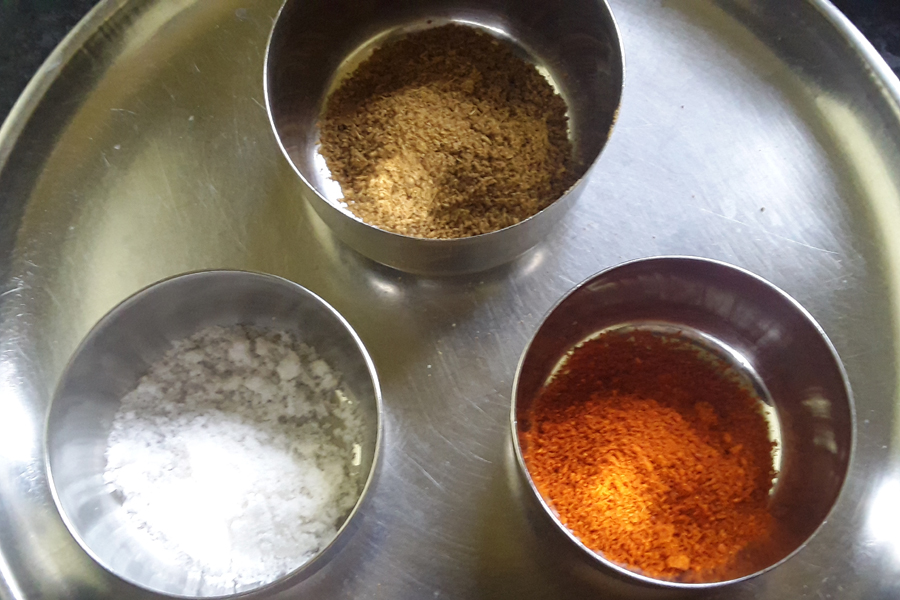 8. Take powdered spices, red chilli powder, and salt in 3 separate bowls, and keep aside.