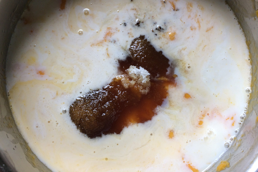 • Add milk, jaggery, cardamom powder, and salt. Please note that the milk that you are adding should be boiled and cooled at room temperature.
