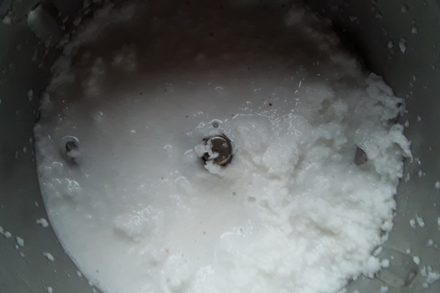 • Take the grated coconut in a mixer jar. Add 1/2 cup water and grind to a smooth consistency. Cover and keep aside.