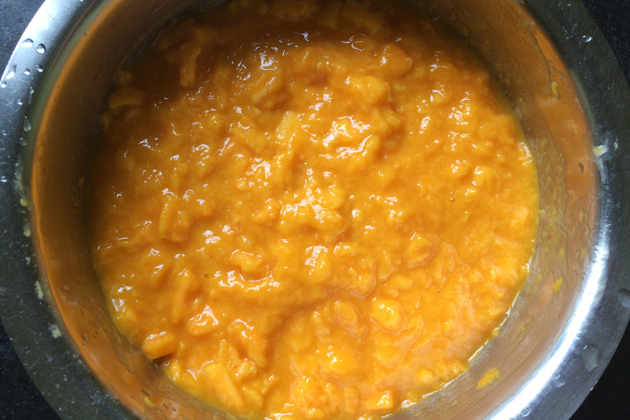 • Take a bowl and squeeze the mangoes such that the juice and small chunks fall into the bowl. Add the mango seed with remaining pulp to the bowl.