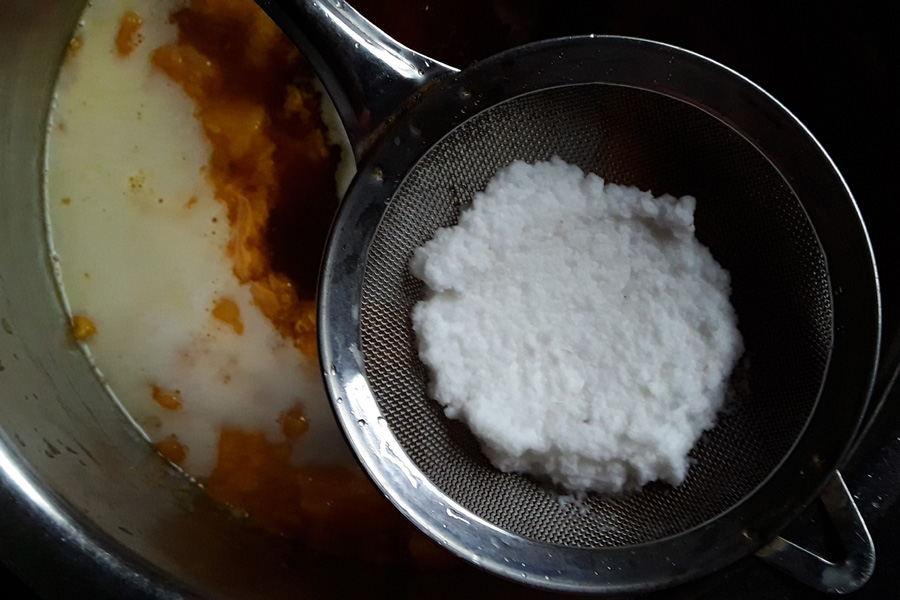• Place a fine strainer on the bowl with squeezed mango pulp. Pour the ground coconut.